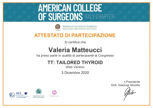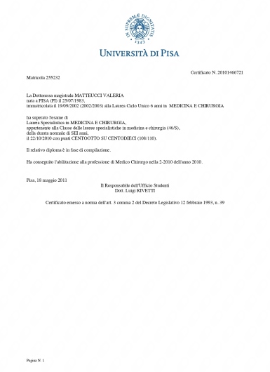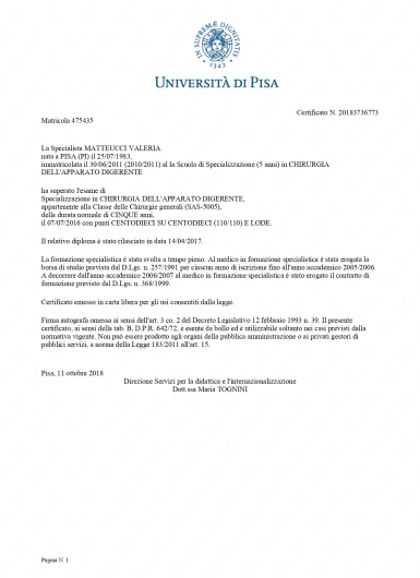 Ringraziamento formale Giuseppe Monaco . Tireidectomia totale in Cisanello . Con la presente intende esprimere il proprio più profondo e sentito ringraziamento per l’altissima professionalità, la prontezza decisionale e la straordinaria dedizione dimostrate dalla Dott.ssa Valeria Matteucci in occasione di intervento di tiroidectomia cui