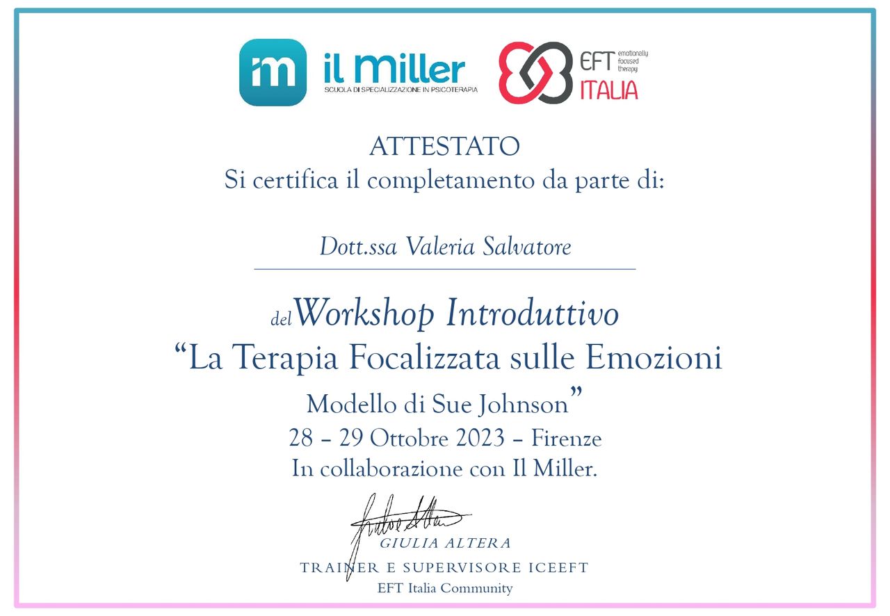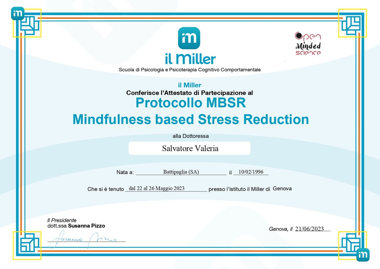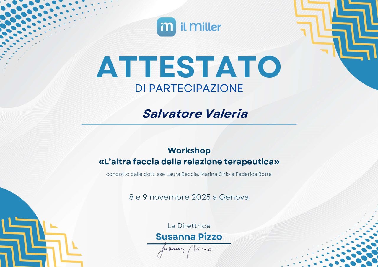 Ciao, sono la dott.ssa Valeria Salvatore, psicologa clinica iscritta all'albo dell'Emilia-Romagna e psicoterapeuta Cognitivo-Comportamentale in formazione presso Il Miller di Firenze. In qualità di socia dell'Associazione Italiana di Analisi e Modificazione del Comportamento (AIAMC), lavoro secondo modelli e strumenti validati dalla ricerca scientifica per favorire il benessere psicologico.
