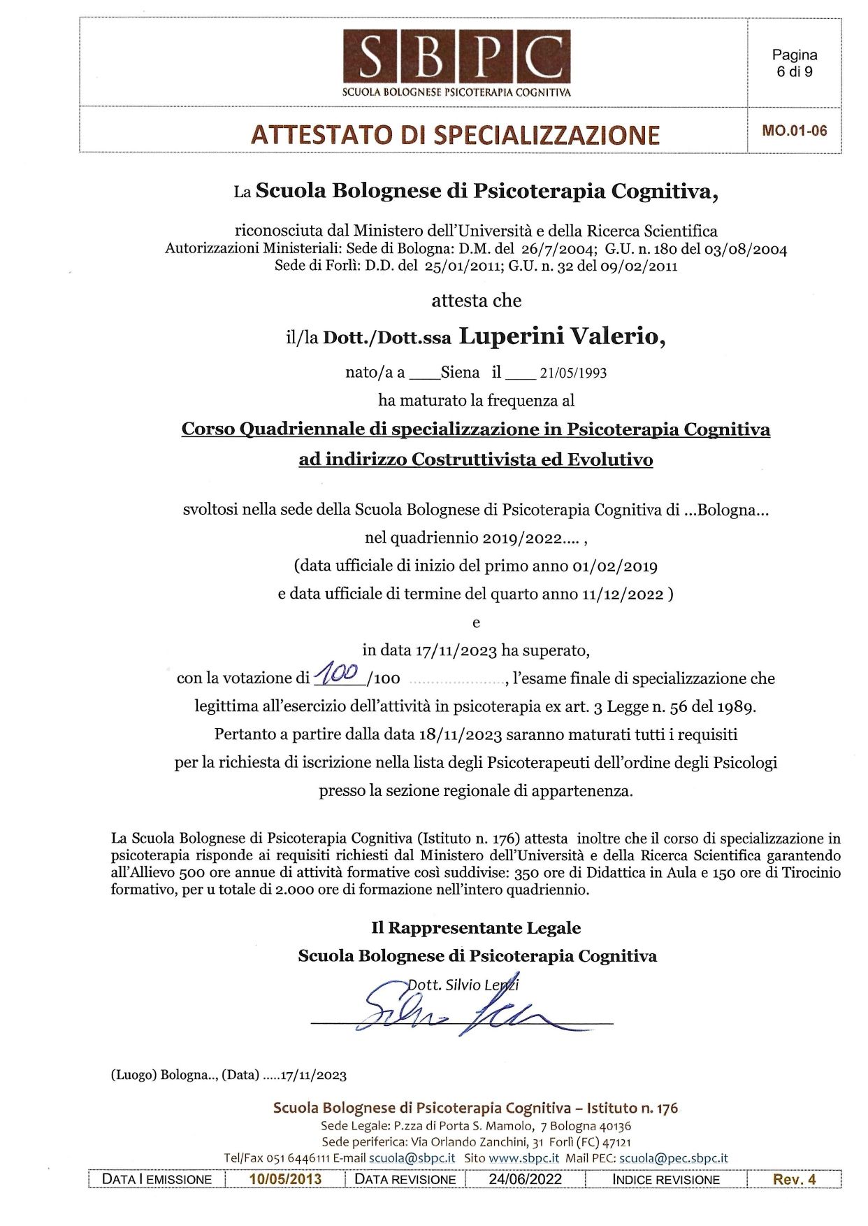 ESPERIENZE FORMATIVE: Dopo aver concluso la Laurea Magistrale in Psicologia Clinica all'Università di Bologna, nel 2022 ho terminato la formazione presso la Scuola Bolognese di Psicoterapia Cognitiva (SBPC) e nel 2023 mi sono specializzato come psicoterapeuta. La frequentazione della Scuola Bolognese di Psicoterapia Cognitiva, unita alla curiosità che mi spinge alla partecipazione a convegni e corsi di formazione (ad esempio per apprendere l'utilizzo della procedura terapeutica EMDR), mi garantiscono un costante aggiornamento sugli sviluppi e i progressi della Psicologia Clinica e la preparazione necessaria per rispondere a vari bisogni dei pazienti.