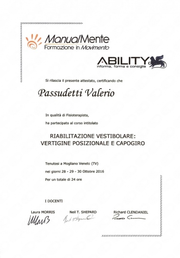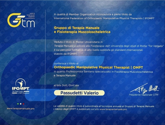 Dopo aver lavorato per anni all'interno di un centro medico polispecialistico e aver avuto modo di trattare pazienti con bisogni ed esigenze differenti - da quello ad accesso diretto al paziente postoperatorio o sportivo - ho deciso di approfondire ulteriormente l'ambito delle problematiche muscolo-scheletriche frequentando un Master di specializzazione della durata di 2 anni in Terapia Manuale Ortopedica e Reumatologica (Orthopaedic Manipulative Physical Therapist) presso l'Università di Roma Tor Vergata (dove al momento collaboro come Assistente alla Didattica) e di istituire assieme ai miei due colleghi (dott. Schievene e dott. Vido) un punto riabilitativo di eccellenza e di riferimento - Studio di Fisioterapia METEM.