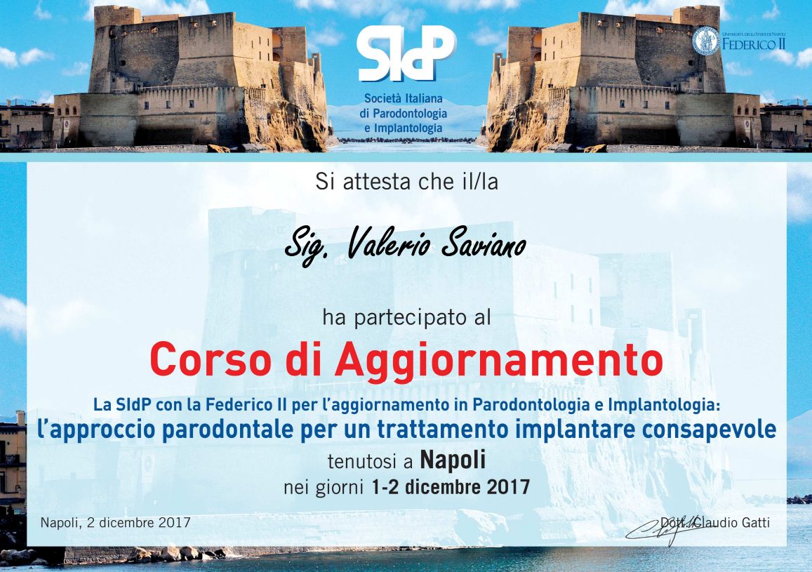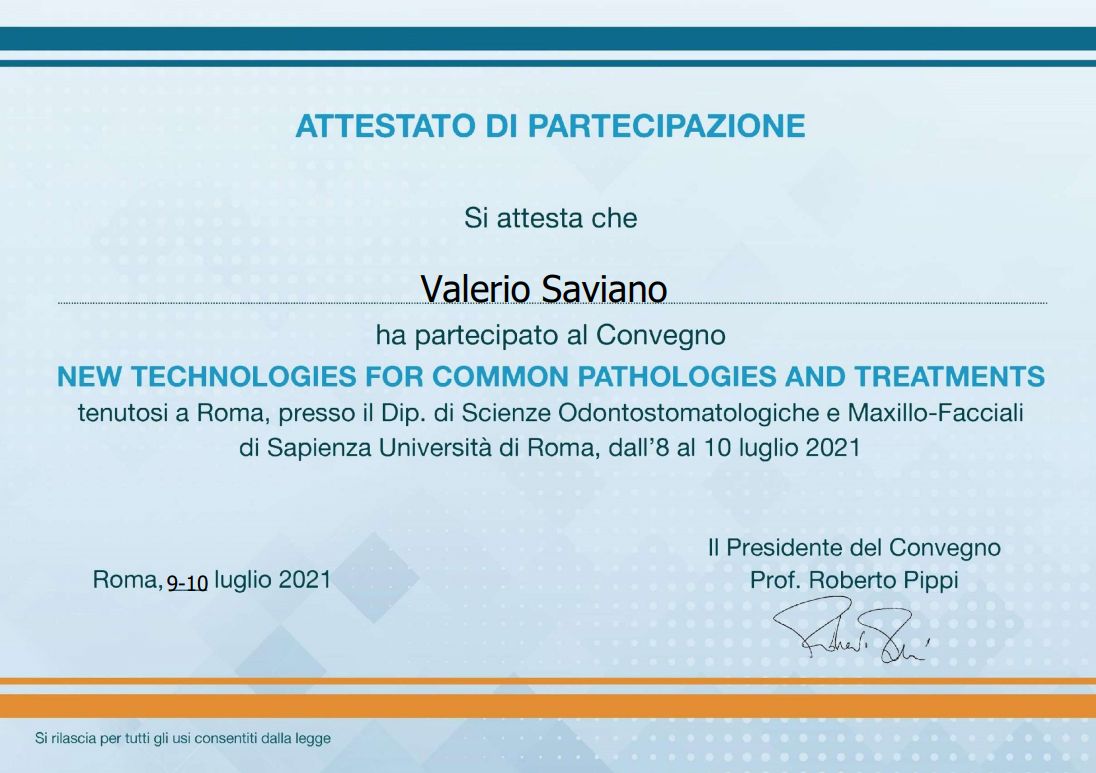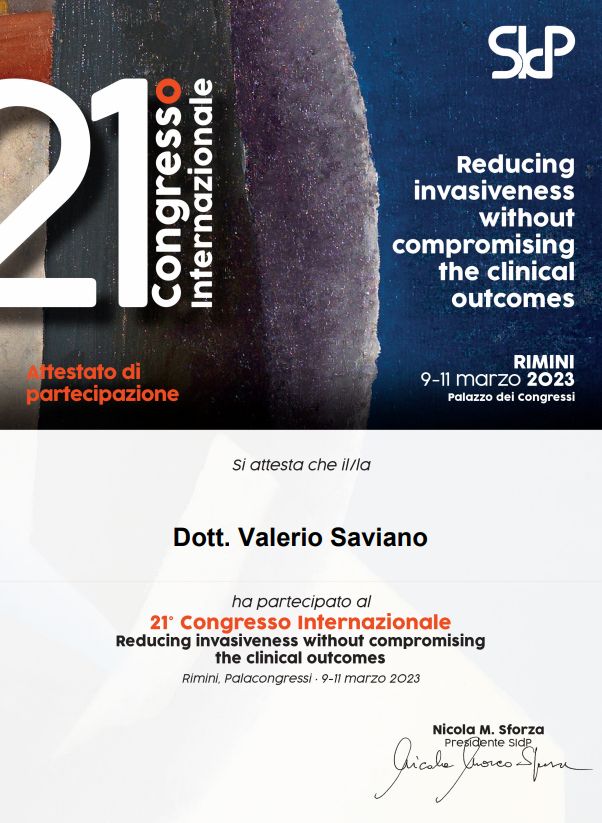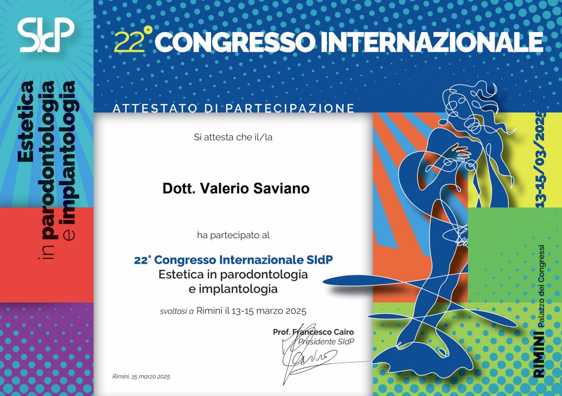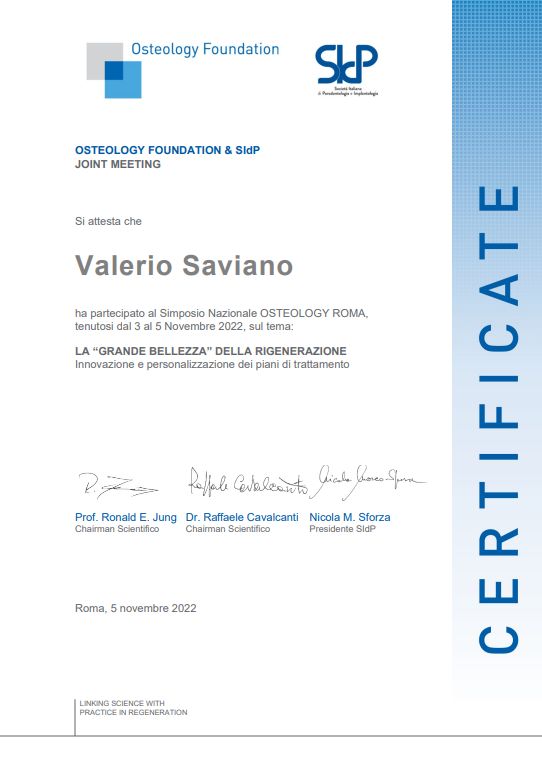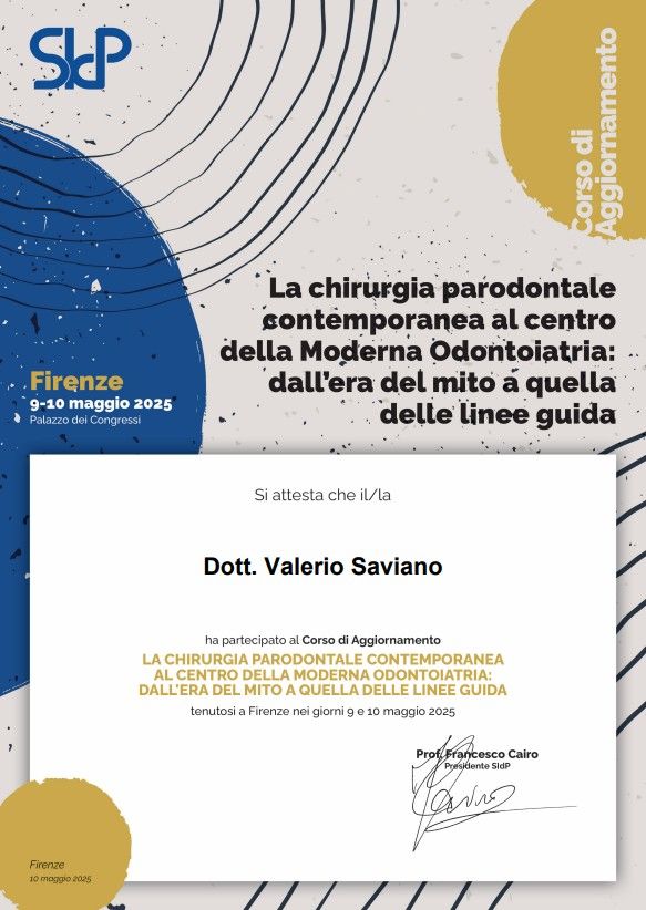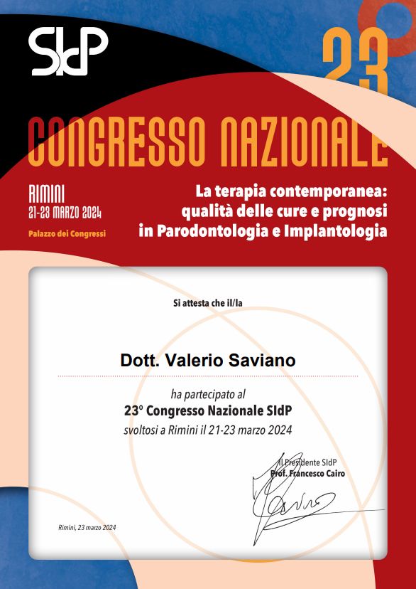 Ad oggi il dott. Valerio Saviano esercita nel suo studio, è impegnato all' università come tutor, oltre a svolgere la sua attività come consulente di Chirurgia Orale, Parodontologia e Implantologia presso altri studi dentistici.