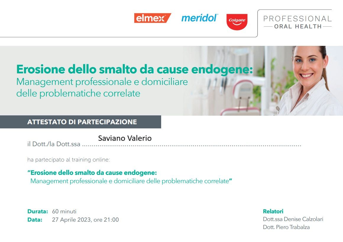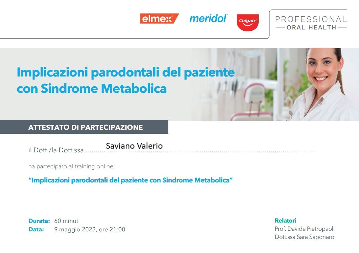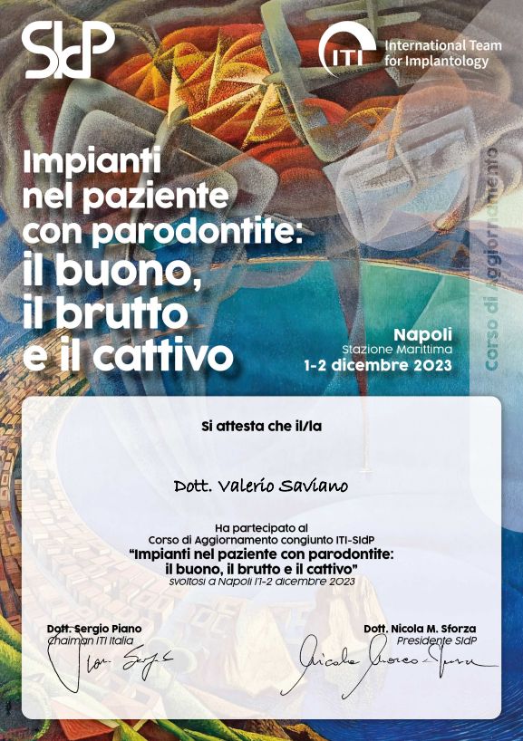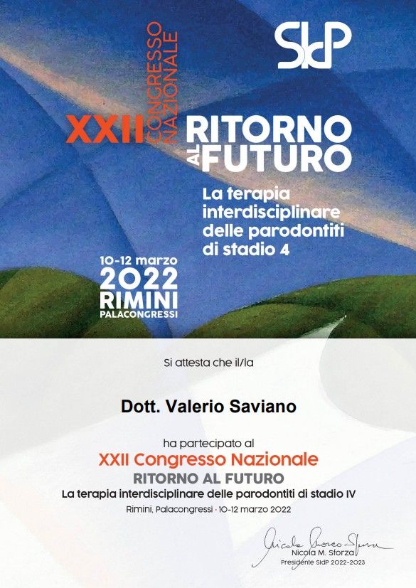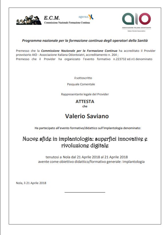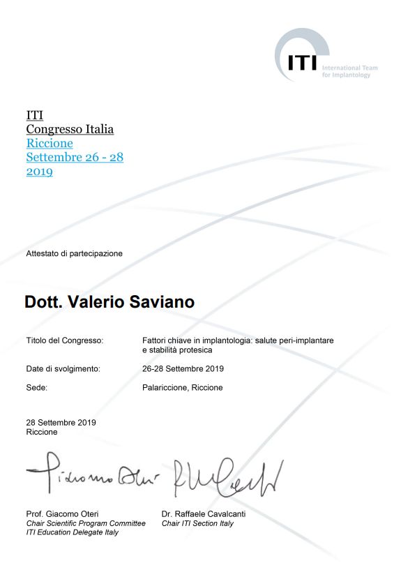 Ad oggi il dott. Valerio Saviano esercita nel suo studio, è impegnato all' università come tutor, oltre a svolgere la sua attività come consulente di Chirurgia Orale, Parodontologia e Implantologia presso altri studi dentistici.
