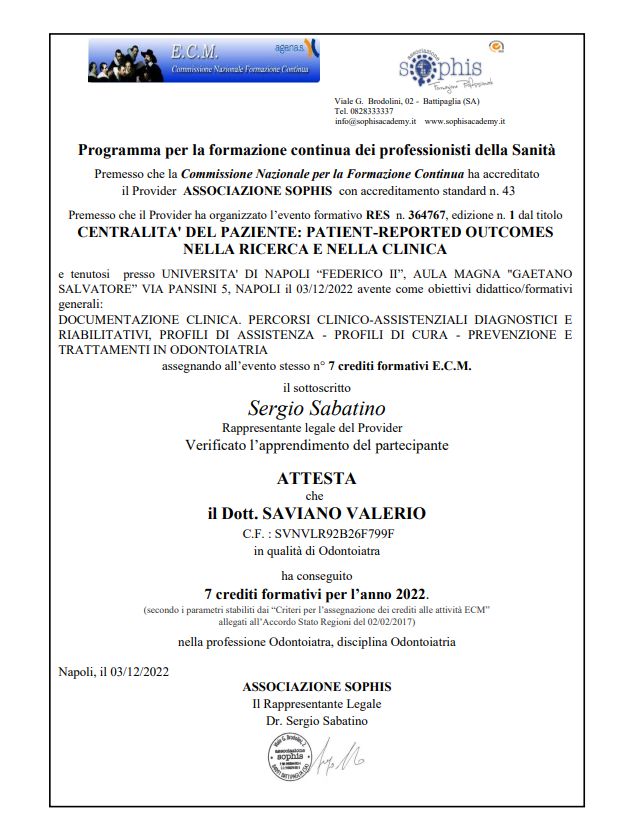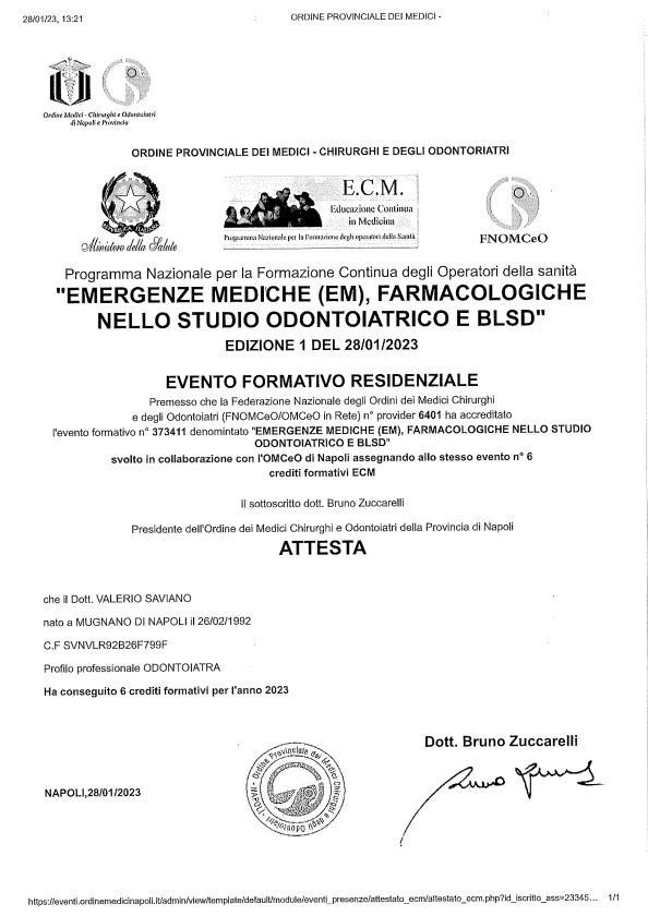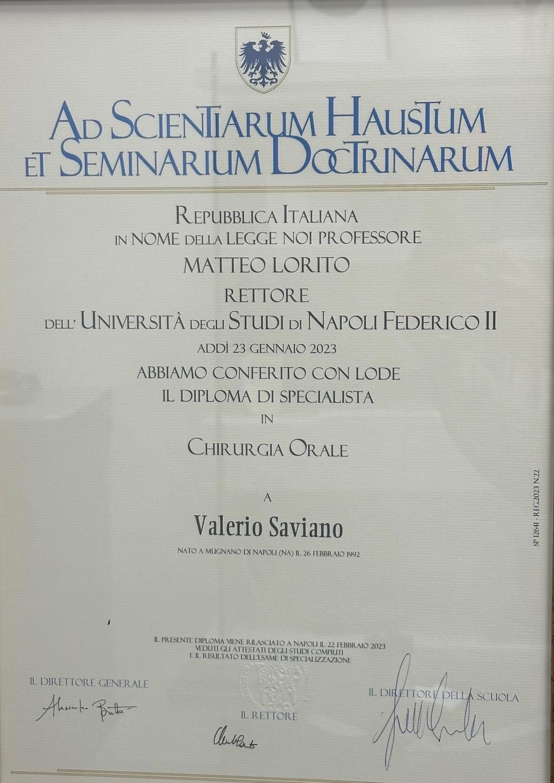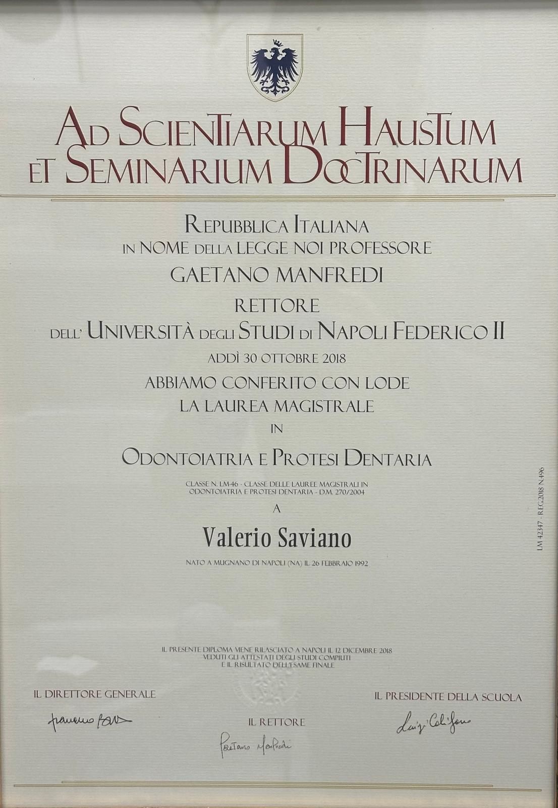 Il dott. Valerio Saviano si laurea con lode nel 2018 in Odontoiatria e Protesi Dentaria presso l'università degli Studi di Napoli Federico II.