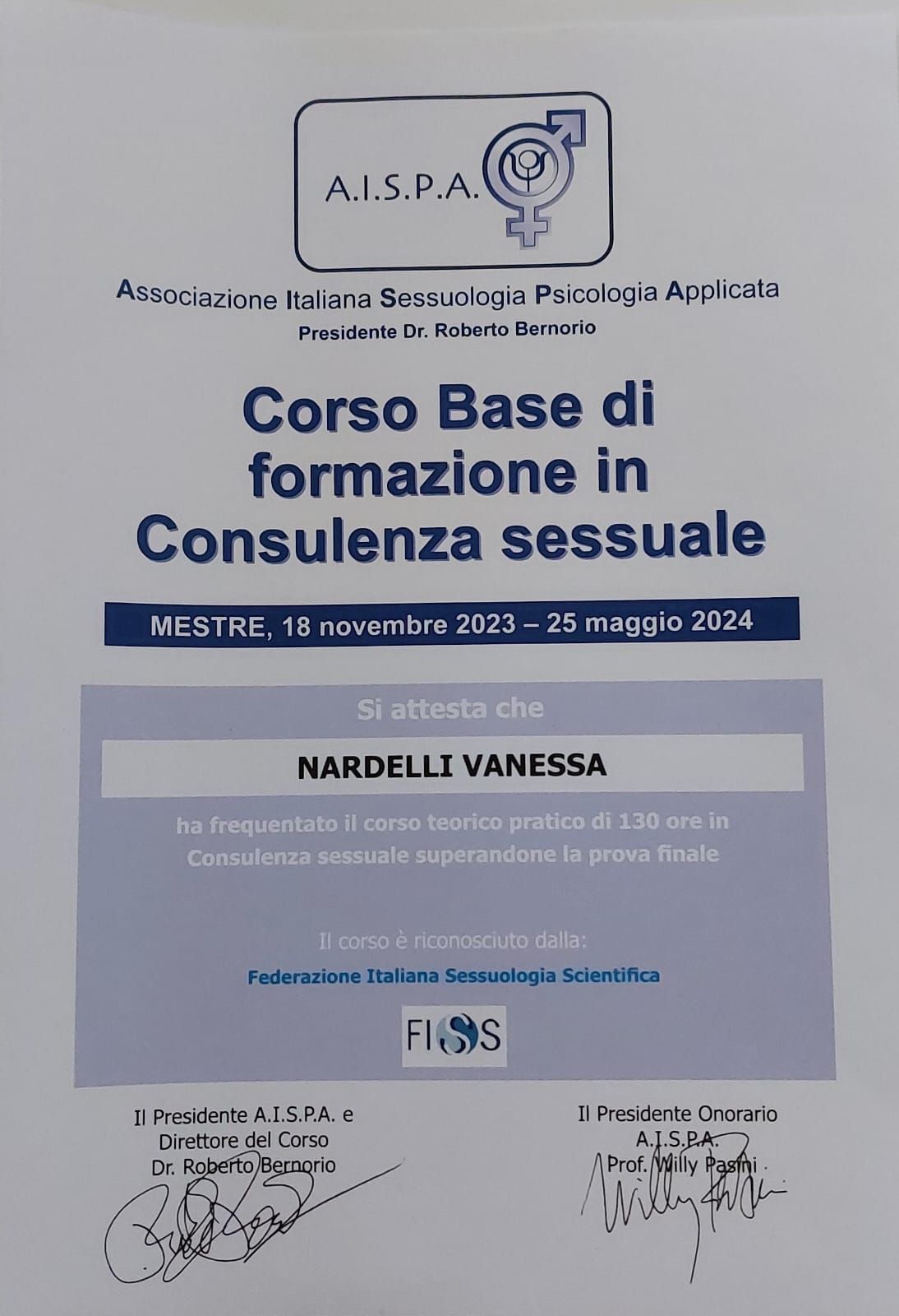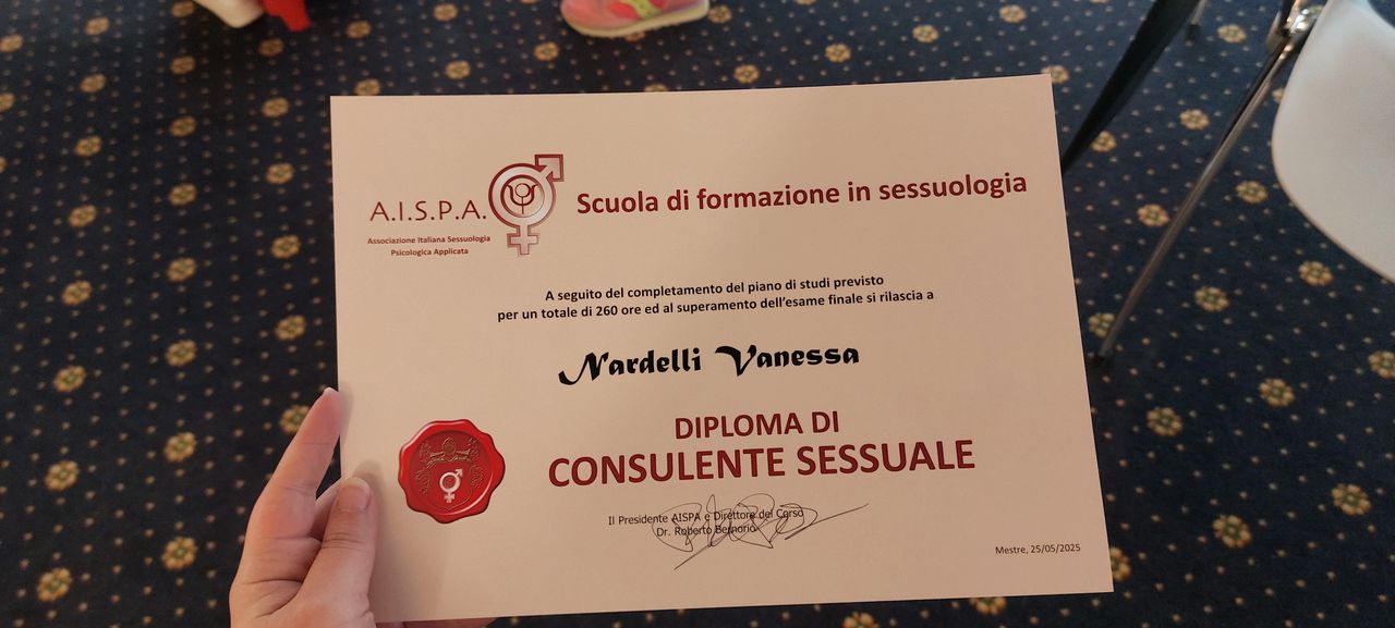 Ho conseguito il diploma da Consulente Sessuale presso l’Associazione Italiana Sessuologia Psicologia Applicata A.I.S.P.A. in sede a Mestre e sono iscritta alla Scuola di Psicoterapia Cognitiva SPC di Verona, per specializzarmi come Psicoterapeuta Cognitivo-Comportamentale.