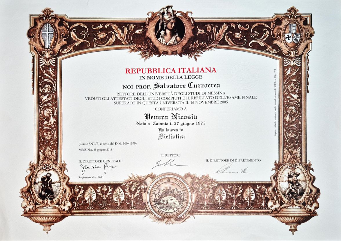 Sono una Dietista laureata presso l’Università degli Studi di Messina – Policlinico Universitario.
