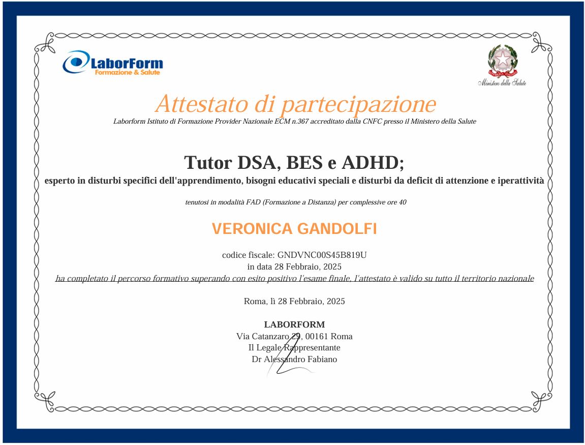 Mi occupo anche di tutoraggio scolastico per bambini e ragazzi, aiutandoli a costruire un metodo di studio personalizzato, sviluppare autonomia e rafforzare l’autostima. Sono formata come tutor per bambini e ragazzi con Disturbi dell'Apprendimento (DSA) e ADHD.