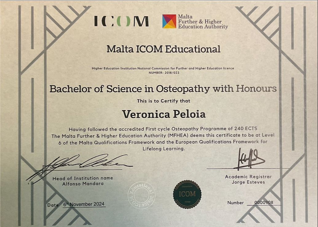 Mi sono laureata in Osteopatia dopo aver concluso un percorso di formazione quinquennale presso ICOM college.