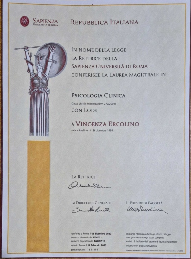 Laureata in Psicologia Clinica con 110eLode all'Università di Roma 'La Sapienza'.