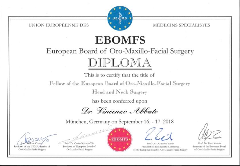 Inoltre, sono membro certificato del Board Europeo di Chirurgia Oro Maxillo Facciale (EBOMFS), un riconoscimento che attesta il mio impegno nella formazione continua e nell’eccellenza professionale.