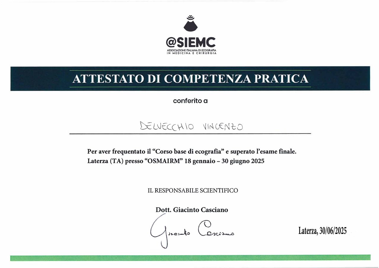 Medico di medicina generale a Laterza (TA). Ecografista SIEMC. Anni di esperienza nei reparti ospedalieri di Urgenza, di Chirurgia Generale ed Endoscopia Diagnostica ed Interventistica.