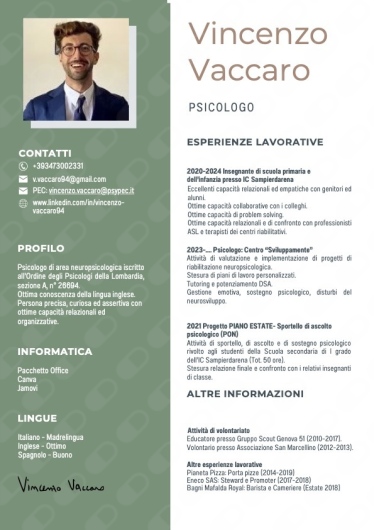 Mi reputo una persona curiosa, precisa ed assertiva, aperto al dialogo, al gioco e alla relazione, con ottime capacità empatiche e di problem solving.