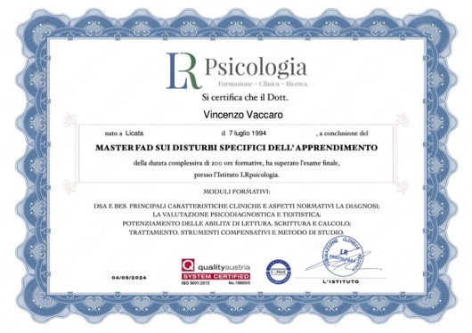 Successivamente ho frequentato un Master in Neuropsicologia dell'adulto presso l'Università Cattolica del Sacro Cuore di Milano e un Master sui disturbi dell'apprendimento (DSA) presso LR Psicologia.