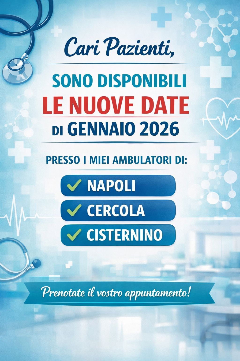 Si informa la Gent.le Clientela, che sono disponibili le prenotazioni di Gennaio 2026 presso tutti i miei ambulatori. Buon Anno !!
