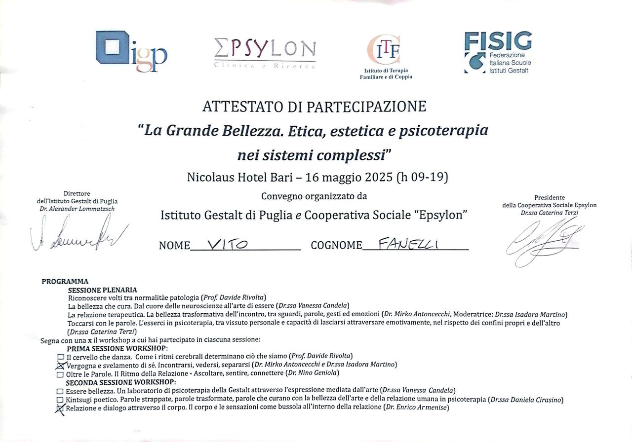 L'esperienza con il dott. Vito Fanelli è stata per me davvero edificante sotto molti punti di vista. Grazie alla sua guida sono riuscito a comprendere meglio me stesso e a migliorare la mia vita.