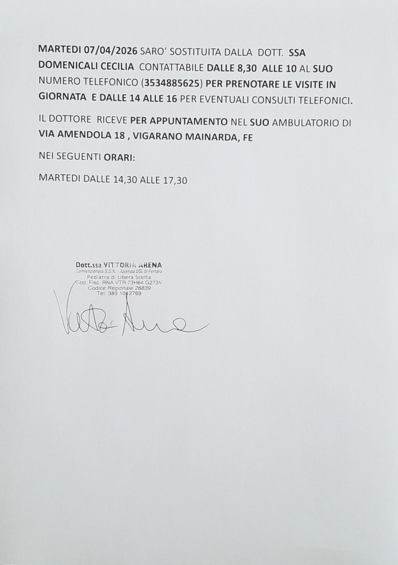 MARTEDI 7 APRILE SARO' SOSTITUTA DALLA DOTT.SSA DOMENICALI CECILIA , TELEFONO 3534885625 VEDI SOPRA