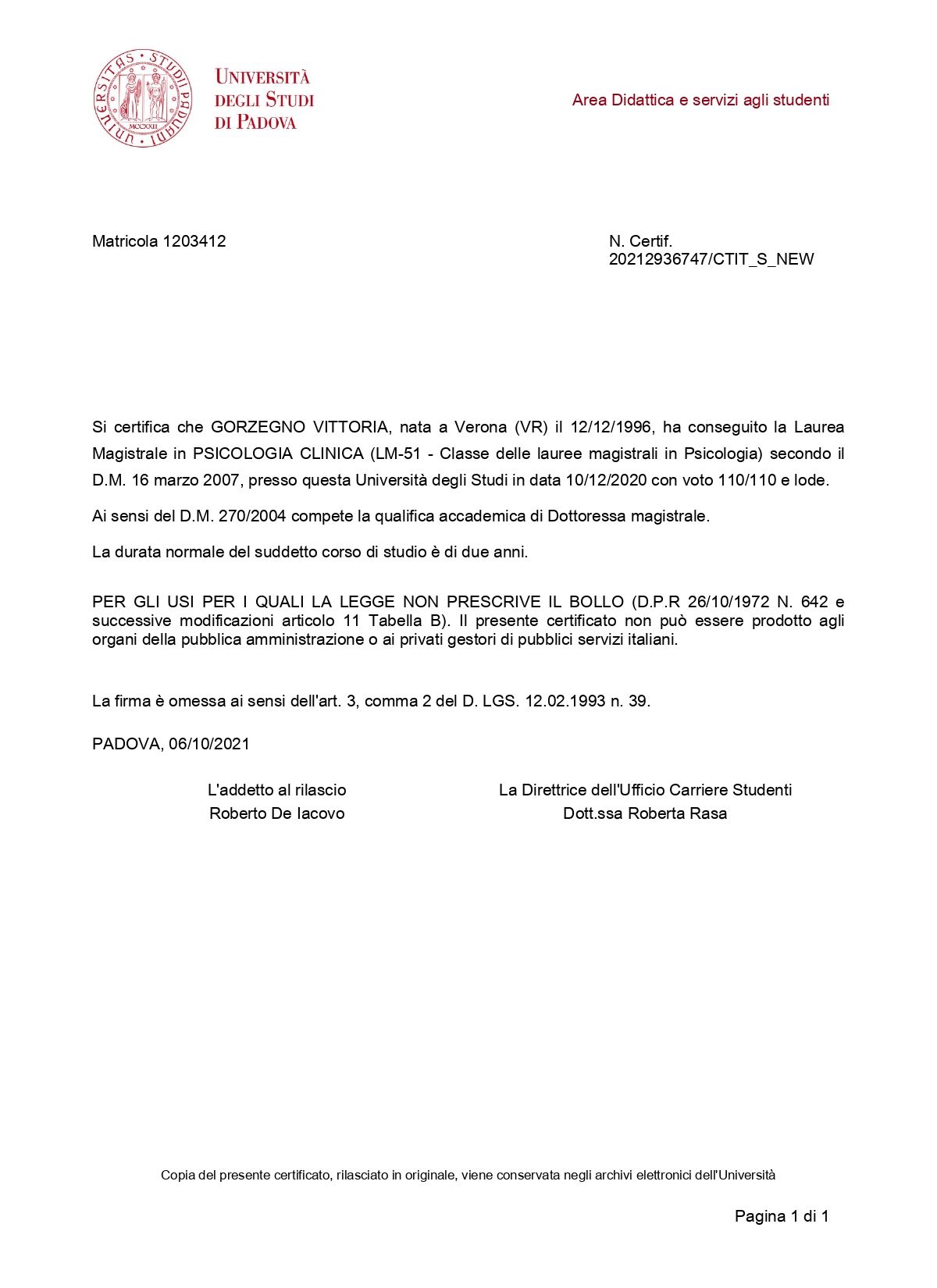 Laureata con lode in Psicologia Clinica presso l’Università degli studi di Padova, nel corso del mio percorso formativo e professionale ho avuto l’opportunità di interfacciarmi con bambini e adolescenti proponendo progetti di Intelligenza emotiva per supportarli nel riconoscimento e nella gestione delle proprie emozioni. Svolgo inoltre colloqui di supporto psicologico rivolti ad adolescenti per aiutarli ad affrontare momenti di fragilità nel loro percorso di crescita. Svolgo colloqui di supporto alla genitorialità e colloqui rivolti ad adulti per la gestione di momenti di criticità incontrati nel corso della vita.
