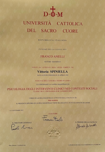 Mi chiamo Vittoria Spiniella e sono una psicologa iscritta all’Albo delle Psicologhe e degli Psicologi del Veneto (n. 13546).