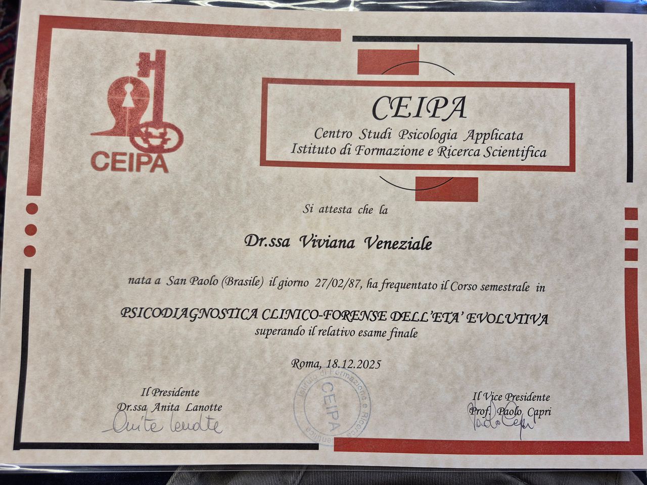 Professionista empatica e preparata. La Dott.ssa Viviana Veneziale ha saputo creare fin da subito un clima di fiducia, facendola sentire accolta e compresa. Grazie al suo approccio delicato ma competente, sono riuscita a comprendere meglio alcune difficoltà emotive e comportamentali, trovando insieme strategie efficaci per affrontarle. Sempre disponibile anche nel supportare i genitori nel percorso. Consigliatissima per chi cerca una figura professionale attenta e specializzata nel lavoro con i bambini.