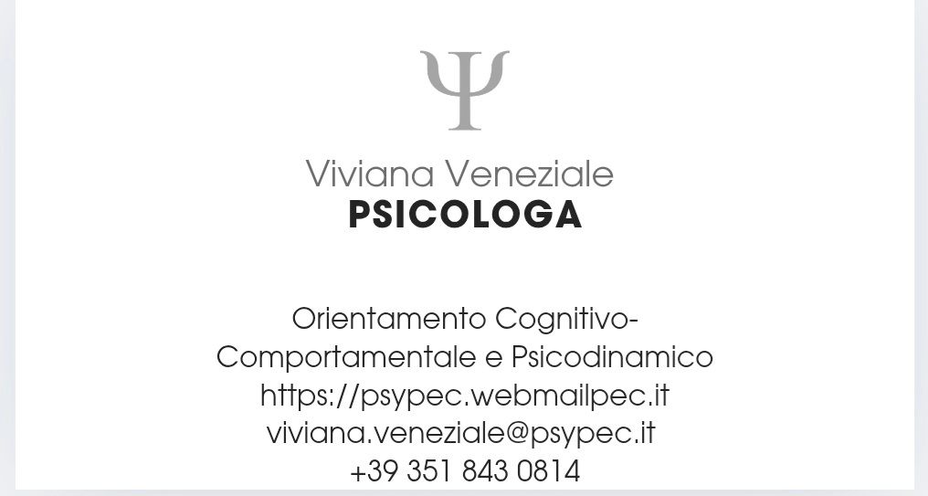 La Dott.ssa Viviana Veneziale mi ha aiutata molto nel mio percorso di consapevolezza: è preparata, disponibile, empatica ed capace sia di grande ascolto che di comunicare in modo efficace. Grazie al suo supporto ho compreso e affrontato dinamiche relazionali che non pensavo di aver adottato e sono riuscita a trasformare in modo decisamente più funzionale e sereno il mio modo di reagire e di affrontare le più diverse circostanze. Prima mi sentivo sopraffatta dagli eventi mentre ora sento di avere gli strumenti per poter superare quel che mi appariva insormontabile. Non posso che consigliarla a chiunque abbia bisogno di una ripartenza.
